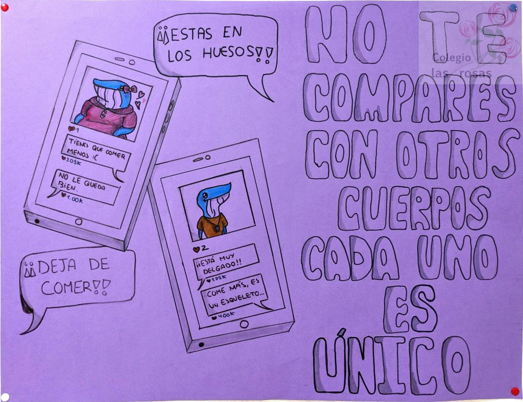 Desde tutoría en colaboración con el Dpto. de Orientación, el curso de 3º ESO ha realizado su propia campaña de prevención de los trastornos de la conducta alimentaria, trabajando ideas como la diversidad corporal, la presión por la estética, el diálogo positivo y el desarrollar una mirada crítica hacia los mensajes que vemos en anuncios, series, y redes sociales respecto a la exigencia con el físico.
