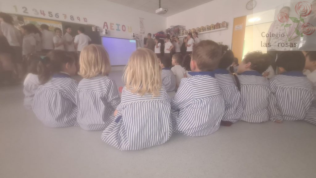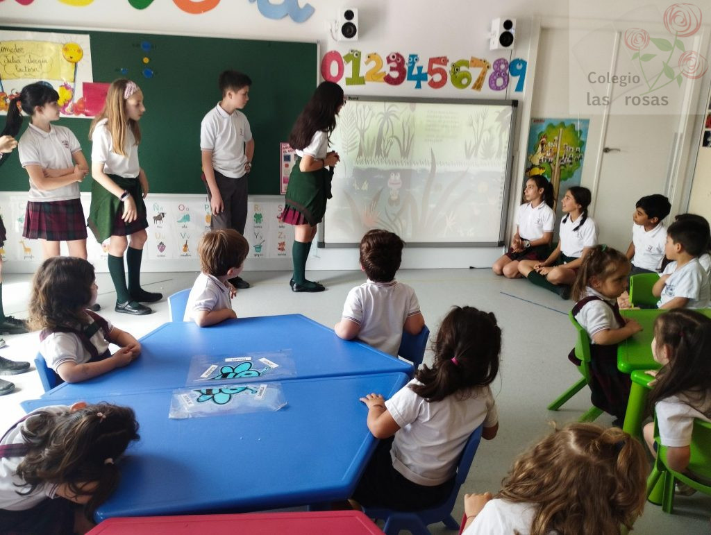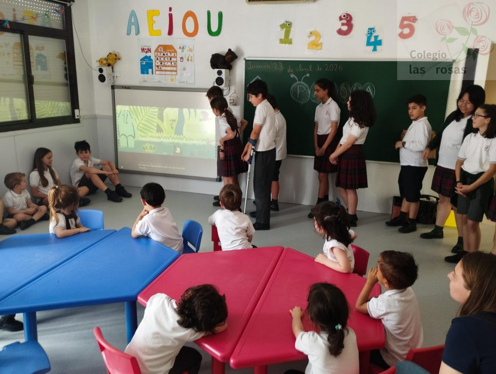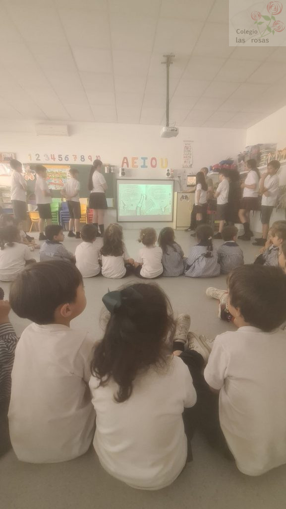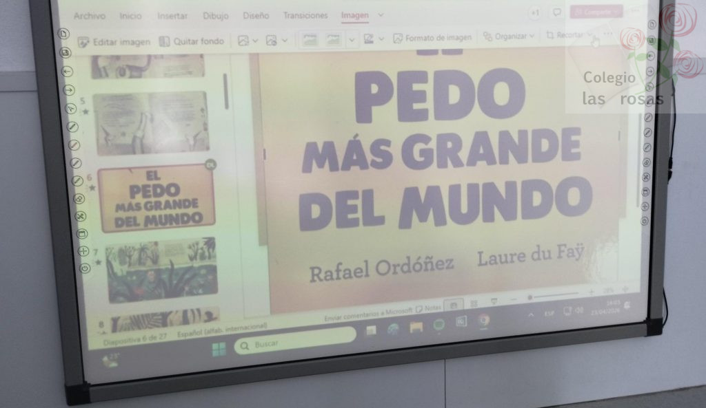 El alumnado de sexto de primaria celebra el Día del Libro con un cuentacuentos para sus compañeras y compañeros de Infantil. Con ayuda de la tecnología, las coloridas ilustraciones del libro El pedo más grande del mundo cobran vida a escala gigante. Con una mezcla de picardía y entusiasmo, los mayores narran la disparatada competición animal mientras los pequeños de infantil estallan en carcajadas incontrolables ante cada efecto de sonido exagerado.